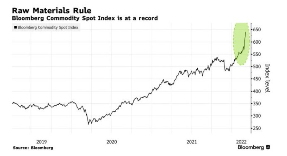 在资金突然涌入之际,炽热的通货膨胀对其他资产造成了影响。大宗商品往往被视为一种对冲消费成本上升的手段。在大宗商品市场库存本已紧张之际,俄罗斯和乌克兰战争也加剧了对原材料短缺的担忧。Bloomberg商品现货指数上周创下新高。