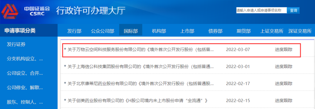 2022年3月7日,中国证监会国际部披露了 万物云空间科技服务股份有限公司 ( 下称“万物云 ”) 提交的《股份有限公司境外首次公开发行股份(包括普通股、优先股等各类股票及股票派生的形式)审批》材料。