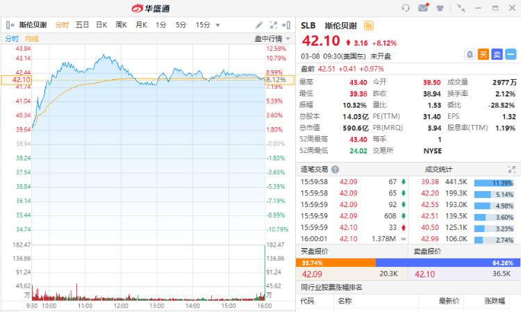 周一在石油、天然气服务行业扮演重要参与者的股票大幅收涨。能源行业中,领涨的是行业巨头斯伦贝谢 $SLB ,周一收涨超8%;哈里伯顿 $HAL 公司大涨6%;而规模较小但波动更大的国民油井华高 $NOV 公司暴涨16%。