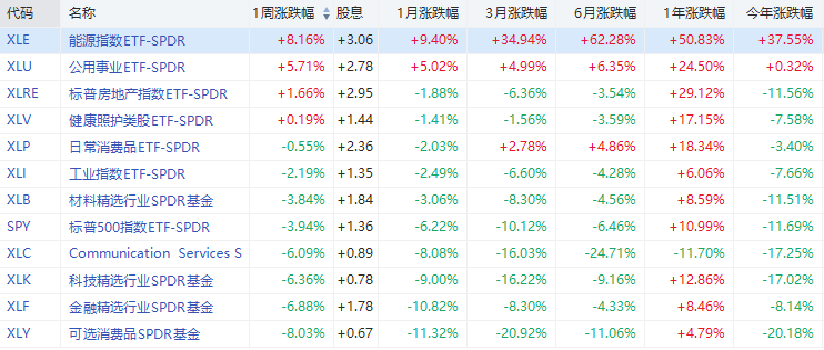 周一,道指 $DJI 、标普500指数 $SPX 和纳指 $IXIC 等主要指数大幅下跌,而能源股票普遍表现良好。美国基准原油期货周一盘中一度涨破130 美元/桶。能源股最近表现一直优于其他行业股票,在标普500中能源板块在过去一周涨幅领先,能源指数ETF-SPDR $XLE 过去一周涨幅达8.16%。