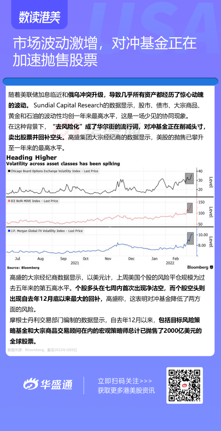 随着美联储加息临近和俄乌冲突升级,几乎所有资产都经历了惊心动魄的波动。Sundial Capital Research的数据显示,股市、债市、大宗商品、黄金和石油的波动性均创一年来最高水平,这是一场少见的协同现象。 在这种背景下,“去风险化”成了华尔街的流行词,对冲基金正在削减头寸,卖出股票并回补空头。高盛集团大宗经纪商的数据显示,美股的抛售已攀升至一年来的最高水平。