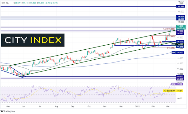 美国在2月11日宣布俄罗斯随时可能对乌克兰发起军事行动,从那天起到今天,不到一个月的时间里,美元指数从当天低点95.64不断上升,最高摸至99.42,斩获近4%的涨幅。