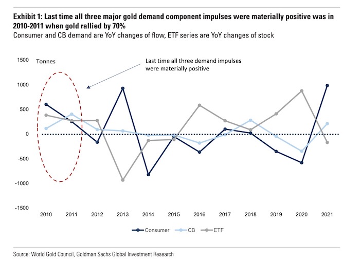 当地时间3月7日,高盛表示,将黄金的3个月、6个月、12个月目标价分别从1950美元、2050美元、2150美元,调高至2300美元、2500美元和2500美元。“近期,商品价格上涨和全球地缘政治不确定性上升意味着,我们对黄金投资和央行需求的上行前景正成为当前的基本情景。同时,主要受亚洲买家推动,黄金消费需求加速增长。我们现在预计,2022年黄金需求的三个主要组成部分都将强劲增长。上一次我们看到所有主要需求驱动因素同时加速是在2010~2011年,当时金价上涨了近70%。”
