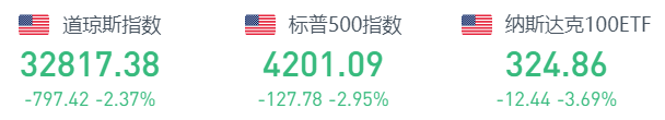 截至3月7日周一收盘,道指收盘下跌797.42点,跌幅为2.37%,报32817.38点;纳指跌482.48点,跌幅为3.62%,报12830.96点;标普500指数跌127.79点,跌幅为2.95%,报4201.08点。