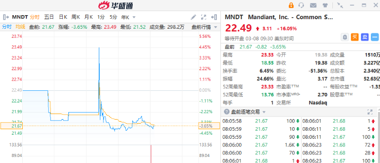 美股盘前,Mandiant跌超3%,据悉,谷歌将以23美元/股的价格收购网络安全公司Mandiant,交易价值达54亿美元,交易预计将于今年晚些时候结束。