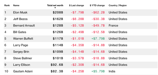 在科技股大幅下跌的情况下,沃伦•巴菲特重新跻身全球前五大富豪之列,仅次于马斯克、贝索斯、LVMH集团董事长伯纳德·阿尔诺和比尔·盖茨。随着伯克希尔哈撒韦(BRK.A.US)股价上涨,巴菲特的财富今年增长了7.2%,至1167亿美元,使他在彭博亿万富翁指数中排名第五。