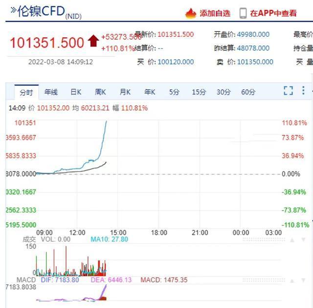 北京时间周二(3月8日)亚盘时段,伦镍逼空行情持续上演,日内涨超100%,连破6万、7万、8万、9万、10万美元关口,两个交易日累计大涨248%,并刷新纪录新高。在不到一个小时的时间里,镍价上演了惊心动魄的“历史性逼空”行情。
