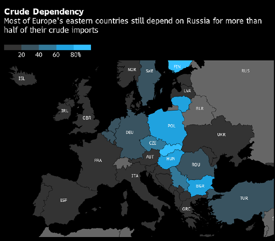 欧洲其他炼油厂则更加依赖俄罗斯乌拉尔原油。德国的PCK Schwedt和Leuna、波兰的Plock等炼油厂直接连接俄罗斯庞大的管道网络,使得他们更难切断关系。