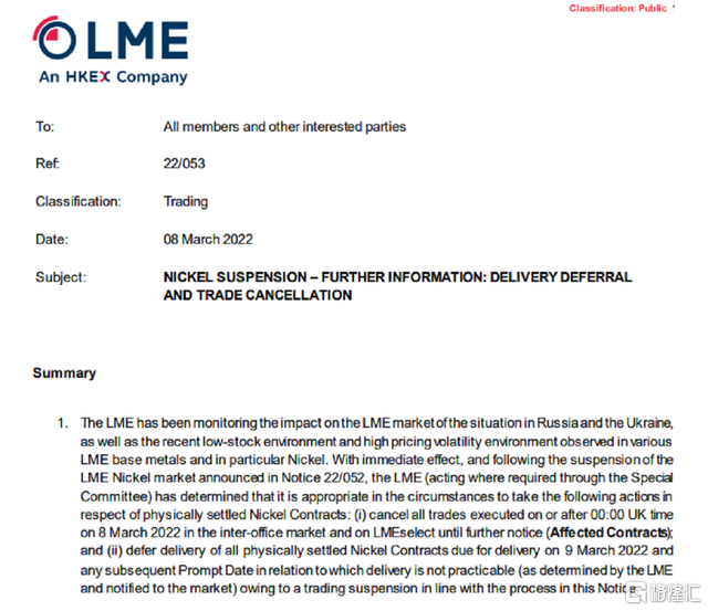 到了昨天夜里,伦敦金属交易所(LME)取消了所有在英国时间2022年3月8日凌晨00:00或之后在场外交易和LME select屏幕交易系统执行的镍交易,并将推迟原定于2022年3月9日交割的所有现货镍合约的交割。