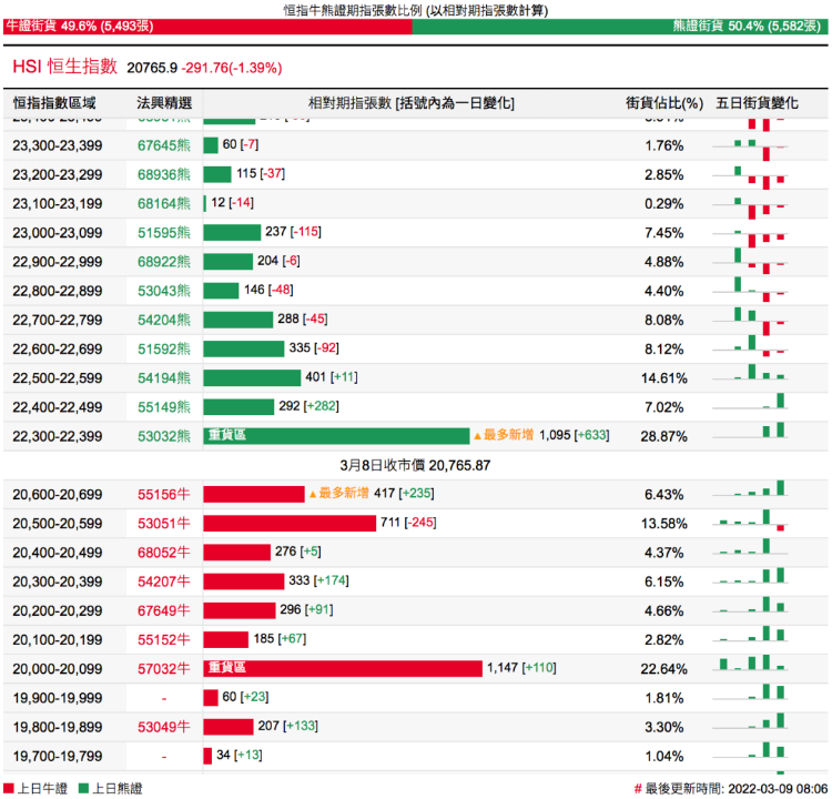 街货分布方面,至周二,恒指牛证街货重货区间主要在收回价20000点至20600点之间,累计相当约2,948张期指合约;恒指熊证街货重货区主要在收回价22300点至22800点,累计相当约2,411张期指合约。