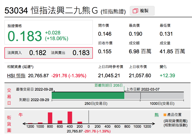 1、强势轮证:恒指法兴二九熊(53034.HK),周二上涨18.06%;