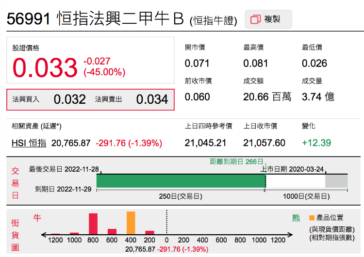 2、看错方向:恒指法兴二甲牛(56991.HK),周二下跌45.0%。