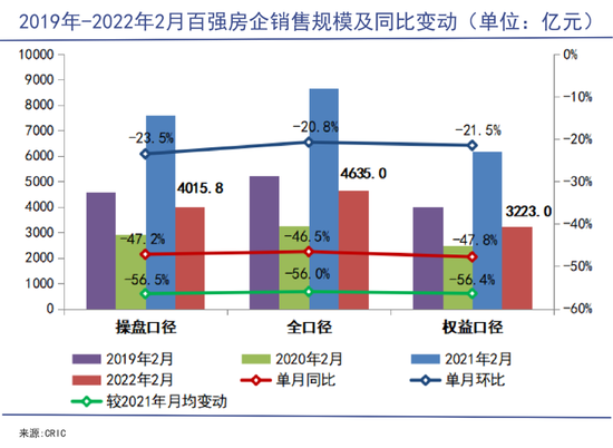 克而瑞数据显示,房企前2月销售额同比大降超4成。单月来看,TOP100房企2月单月卖了4635亿元,同比几乎腰斩,创历史新低。