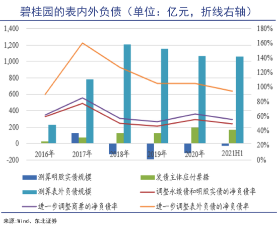 根据东北证券测算,碧桂园表外负债高达1000多亿元,特别是碧桂园的商票规模超过160 亿。如果计入表外负债,碧桂园的净负债率就要从49.7%飙升至100%,超过安全红线。