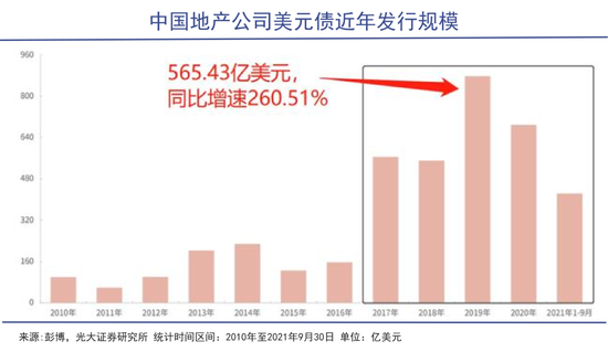 据统计,2019年美元债的发行规模达到历年最高,该年地产公司发行了565.43亿美元的境外债券,同比暴增2.6倍。