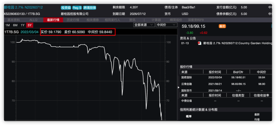 目前来看,碧桂园美元债券大多跌至70美分上下,远期债券则大多跌破70关口,个别债券甚至低于60。比如,于2026年7月12日到期的一笔5亿美元债券价格已下探至59的低位。