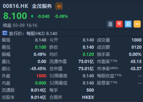 华盛资讯3月9日讯,物管服务商金茂服务 $00816.HK 暗盘平开,现跌0.49%,最新总市值超73亿港元。该股预计将于明日(3.10)正式挂牌上市。