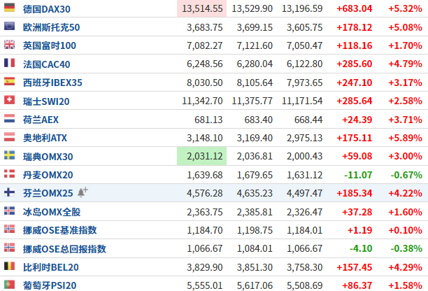 今日,全球股市大反弹,欧洲斯托克50指数、德国DAX指数涨超5%,法国CAC40指数涨超4%,英国富时100指数涨近2%,西班牙IBEX指数涨超3%。