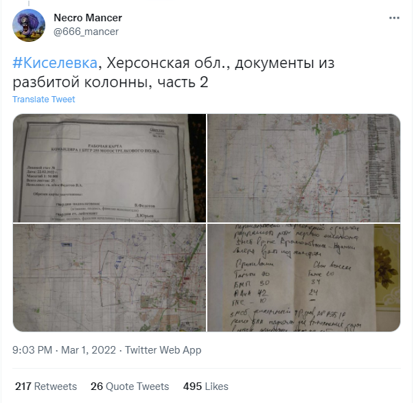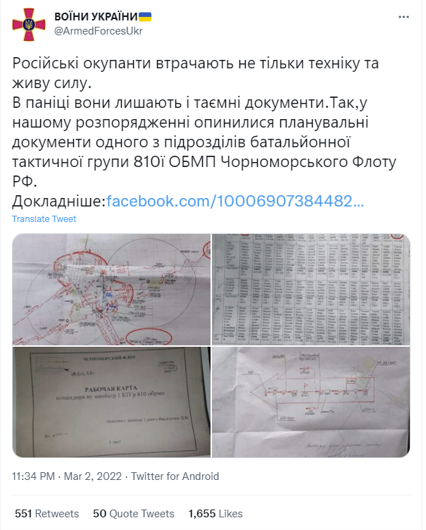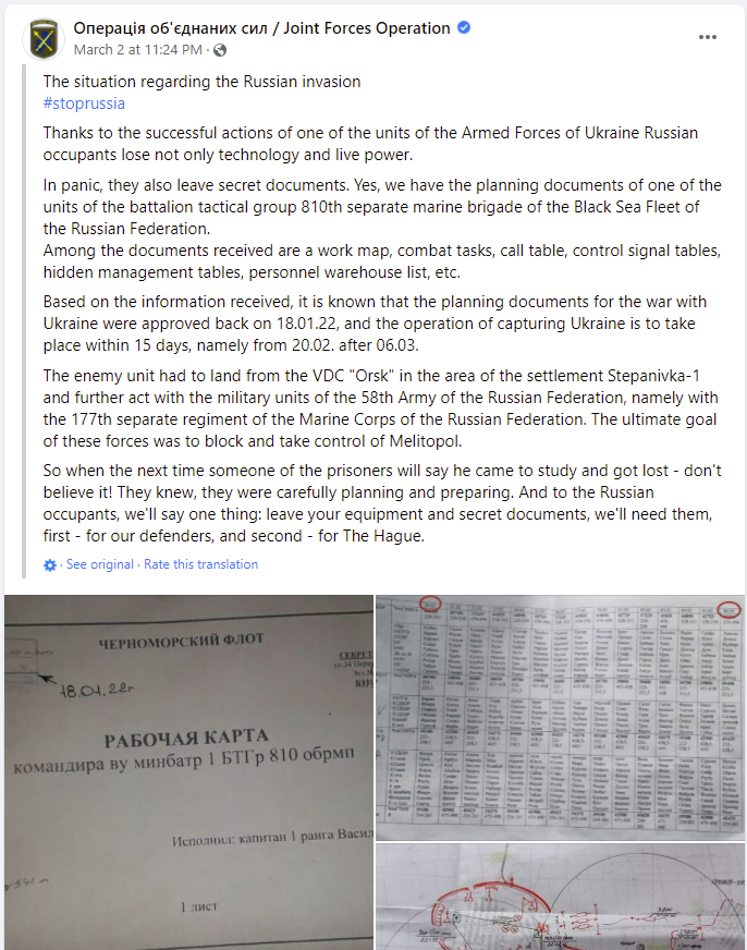 北京时间3月2日夜晚11时24分,JFO在其脸书账号上发布消息,称得到了俄军遗漏的作战计划。