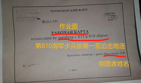 该封面图右下角文字标明,此图的制图者是一位名叫瓦西里丘克(Васильчук)的海军上校,公开资料显示,此人曾在2015-2018年间担任黑海舰队第41导弹舰艇旅的指挥官,隶属克里米亚海军基地。而根据俄罗斯媒体sevastopol.kp在2021年俄罗斯海军陆战队日发布的报道,俄罗斯第810独立海军陆战旅的现任指挥官名叫阿列克谢·沙罗夫 (Алексей Шаров),是一位陆军近卫上校。即便考虑职位变动的因素,810独立海军陆战旅旅长又是否会让一位海军系统内的上校绘制一份供迫击炮连作战使用的陆军指挥官作业图呢?