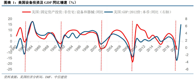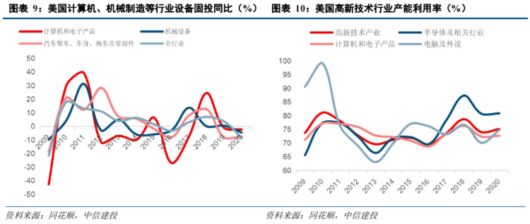 美国设备周期明显,1982年以来已经历四轮完整周期。美国的设备周期较为明显,1982年-2020年期间经历了四轮完整设备周期。(1)1982-1991年,汽车、石油、钢铁等传统行业发展迅猛;(2)1992-2001年,高新技术产业发展带来了美国经济的持续繁荣上升,带来了新的设备投资和工业生产增长点;(3)2002-2009年,美联储降息极大促进了房地产及相关行业的迅猛增长,宽松政策下次贷债券大幅推动了地产泡沫的膨胀,为金融危机埋下了隐患;(4)2010-2020年,美国经济中心由服务业重新转向制造业,确立了“制造业复兴”的整体产业战略部署,计算机、半导体、高端制造等高技术行业成为了主导产业。