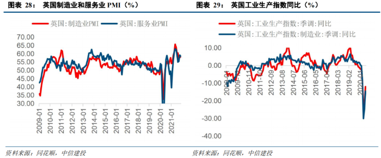 90年代以来英国已经经历三轮产能周期,2020年疫情后开启新一轮设备上升周期。1990-1997年,受益于全球互联网信息产业崛起,英国通信、传媒、金融等行业快速发展,带来新一轮投资热潮。1997年受亚洲金融危机冲击,本轮设备周期进入尾声;1997-2009年,尽管设备投资在亚洲金融危机后有所回升,但90年代末的互联网泡沫破灭,英国股市连续三年下跌,英国通信行业没落,在石油等上游原材料涨价、信贷宽松资金流入建筑业的背景下,英国在2002年后能源开采、房地产行业发展迅速,直到2007年次贷危机爆发,全球投资迎来低谷;2009-2020年,金融危机后,英国政府提出“高价值战略”,意图将高价值制造(HVM)打造成为英国经济增长的主要驱动力,包括精密设备、药物和生物科学、交通、系统和机械。2013年10月英国提出“英国工业2050战略”(《未来制造业:新时代给英国带来的机遇和挑战》),强调优先打造产业供应链的技术路线。2017年英国再推出“现代工业战略”绿皮书,旨在提高制造业生产力,转变高度依赖服务业的产业结构。这段时期中,对高端制造业的投资是经济增长的主要动力,精密设备、机械等产业快速发展。