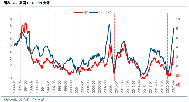 各产能周期中,英国PPI、CPI差异显著。1990-1997年周期中,英国通胀上行后达峰后回落,通胀下行的趋势持续到了下一轮产能周期中。1997-2009年周期中,英国通胀小幅下行后开始回升,并在金融危机前夕达到顶点。2009-2020年周期中,英国通胀走势与美国类似,在2011-2012年期间冲顶,2015年触底,随后在2017-2018年又再次回升。疫情后,英国的通胀走势也呈现快速上升的态势,PPI、CPI增速均接近2007年水平。