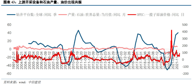 此外,新周期投资受全球各国频出的碳中和相关政策制约。当下在气候变化这问题上全球各国逐渐达成共识,主要经济体均承诺在2050至2060年左右实现碳中和。各国纷纷制定碳中和相关措施,为投资开辟出新的应用场景,资金涌入能够带来更多超额收益的领域,如新能源汽车、可再生能源发电等方向。而传统能源开发受挤出效应及各国环保禁令的影响,新的设备投资周期幅度平缓低迷。油气行业资本开支持续低位,无疑对原油产量造成威胁,叠加OPEC+增产缓慢,全球原油供应缺乏弹性,在疫情后原油需求随经济逐步复苏的背景下,油价保持高位运行。