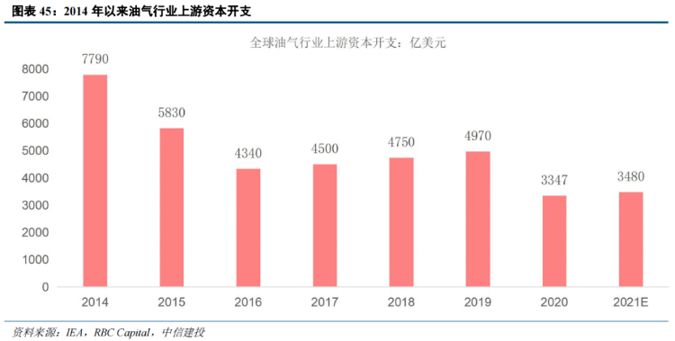 自2021年起,全球油气行业进入新一轮投资周期,但投资扩张速度远逊于前。2020年受疫情影响,全球油气上游资本开支仅为3347亿美元,同比大跌32.66%,2021年原油价格持续回暖,但全球油气资本开支仍然偏紧,同比仅小幅上涨3.97%至3480亿美元,相较于2019年下降30.00%,远低于十年来平均水平。