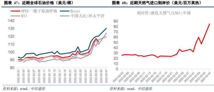 近期,俄乌冲突后全球大宗商品价格异常冲高,油气价格表现尤甚。俄罗斯是欧洲最大的油气贸易伙伴,根据BP能源的数据,2019年、2020年俄罗斯原油出口量分别为289、260百万吨,而欧盟原油进口量2019年、2020年分别为556、475.9百万吨,受俄罗斯油气供给影响巨大。俄乌冲突爆发后,俄罗斯受到西方制裁影响,来自俄罗斯的油气供应前景短期内不明朗,国际能源市场对于全球原油供给收缩的紧张情绪加重,全球油价持续冲高。
