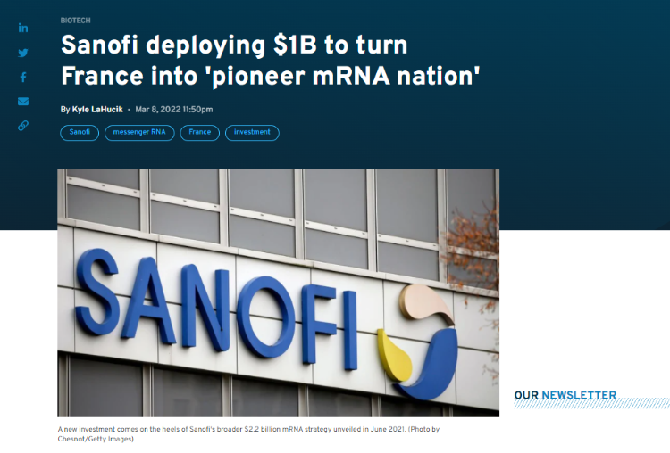 3月8日,赛诺菲于2021年6月公布的22亿美元用于加强其mRNA工作的承诺,本周已经变得更加清晰,其中超过10亿美元现在指定用于法国成为“先锋mRNA国家”。