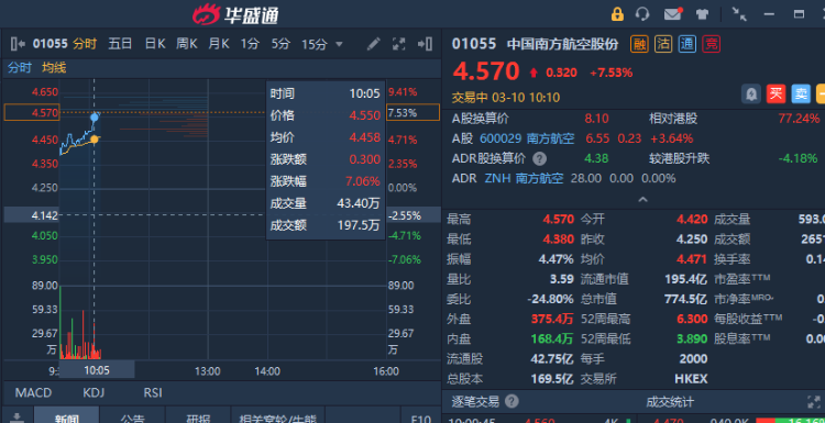华盛资讯3月10讯,港股航空股集体拉升,中国南方航空股份(01055.HK)涨7.53%,国泰航空(00293.HK)涨6.33%,中国国航(00753.HK)涨5.88%,中国东方航空股份(00670.HK)涨5.86%,北京首都机场股份(00694.HK)涨4.35%。