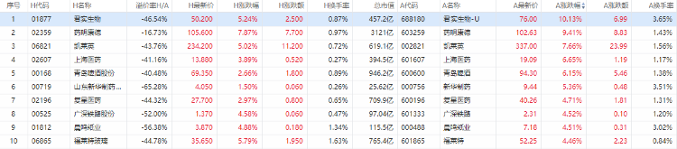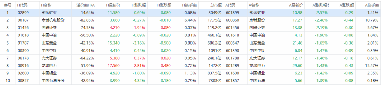 紫金矿业A股跌2.57%,H股跌0.69%,京城机电股份A股跌2.48%,H股跌0.27%,国联证券A股跌2.19%,H股涨1.94%。
