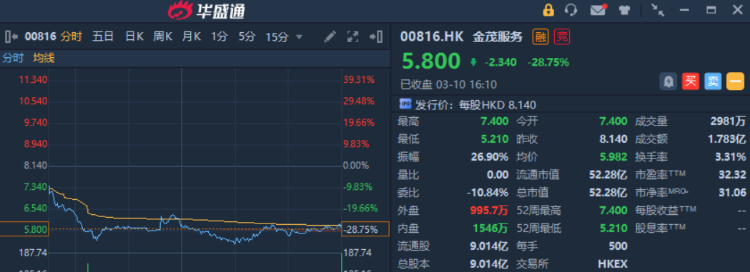 华盛资讯3月10日讯,物管服务商金茂服务 $00816.HK 首挂低开9.09%,尾盘收跌28.75%, 一手 账面浮亏1175港元,全日成交额1.783亿万港元,最新总市值超52亿港元,该股昨日暗盘收跌4.55%。
