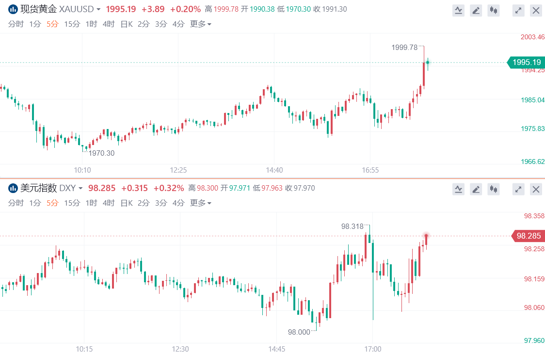 现货黄金闻讯短线拉涨16美元,最高触及1999美元/盎司;现货白银拉涨0.34美元,至25.72美元/盎司;美元指数短线走高,升至98.28。