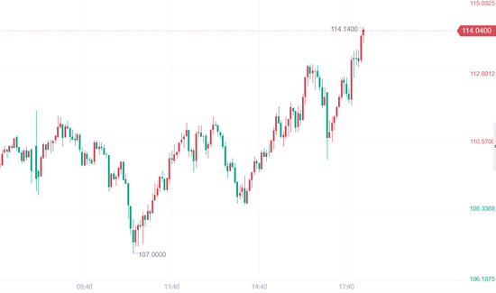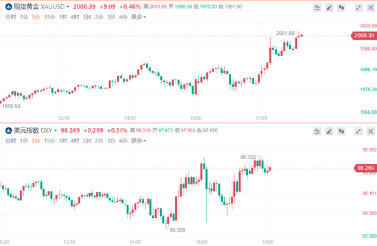 现货黄金闻讯短线拉涨16美元,随后继续震荡上行,突破2000美元大关;现货白银拉涨0.34美元,至25.72美元/盎司;美元指数短线走高,升至98.28。