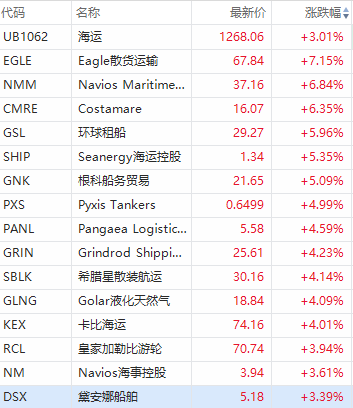 受俄乌冲突以及部分国家对俄罗斯实施制裁影响,全球供应链产生了一系列连锁反应,进而使得全球航运网络存在高度不确定性,船舶严重延误。美海运概念股现涨幅居前,Eagle散货运输涨超7%,Costamare涨超6%,环球租船、Seanergy等涨超5%。