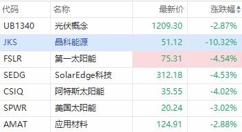 美股光伏太阳能板走低,晶科能源(JKS)跌超10%,大全新能源(DQ)跌超9%,阿斯特太阳能(CSIQ)、第一太阳能(FSLR)跌超4%,应用材料(AMAT)跌超2%。
