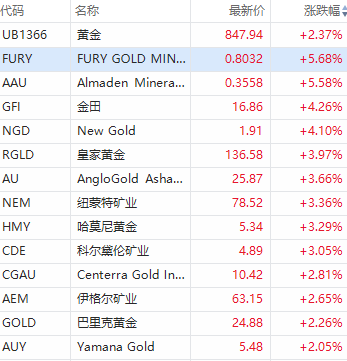 市场避险情绪上升,现货黄金上涨12美元,报2003.23美元/盎司,黄金股逆市走强,金田涨超4%,哈莫尼黄金、纽曼矿业涨超3%,巴里克黄金和伊格尔矿业涨超2%。