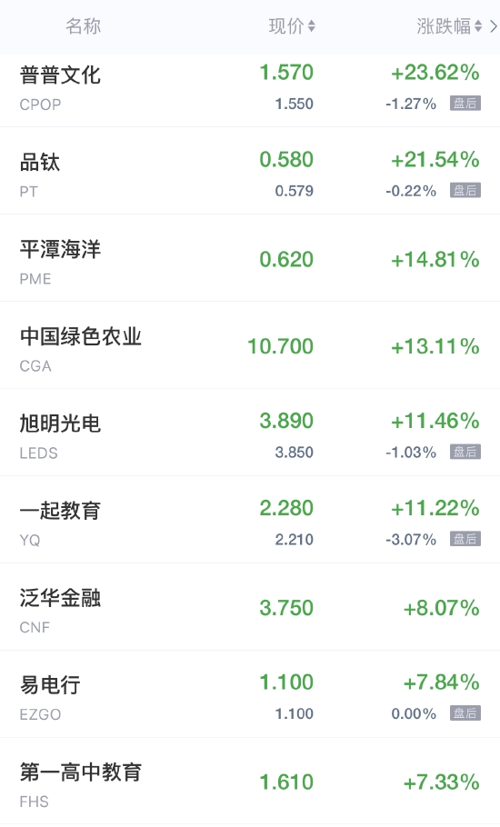普普文化涨超23%,一起教育涨超11%,易电行涨近8%,第一高中教育涨超7%,人人公司涨近6%,陆金所控股涨近5%。