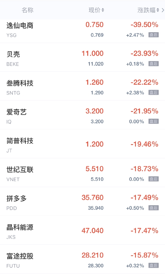 领跌中概股列表: