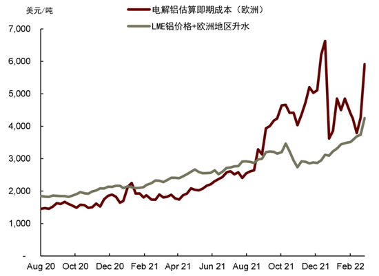 4)国内电解铝利润扩大,复产积极性较高。根据我们的供需平衡,如果不考虑俄乌冲突带来的供需影响,今年计划中的新增供应将主要来自于南美、俄罗斯、马来西亚以及中国的冶炼厂增产和复产,但全球供需缺口较2021年仍有所扩大。目前来看,中国铝厂现金利润较高(图表6),复产积极性较大。根据Woodmac,截至目前国内已有88万吨产能复产爬坡,可能在二季度贡献国内增量。但我们认为国内复产产量难以弥补欧洲产量减少以及俄罗斯供给风险。虽然需求端因价格偏高有所滞后,但尚未出现实质意义上的需求破坏。基于目前的情况,我们认为2022年全球铝供需缺口仍将扩大。