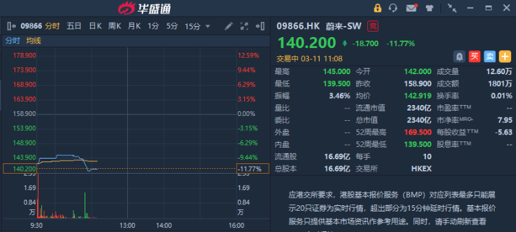 与此同时,蔚来3月10日正式在港交所挂牌交易,股票代码为“9866”。开盘价为每股160港元,盘中一度触及169.5港元/股的高点。
