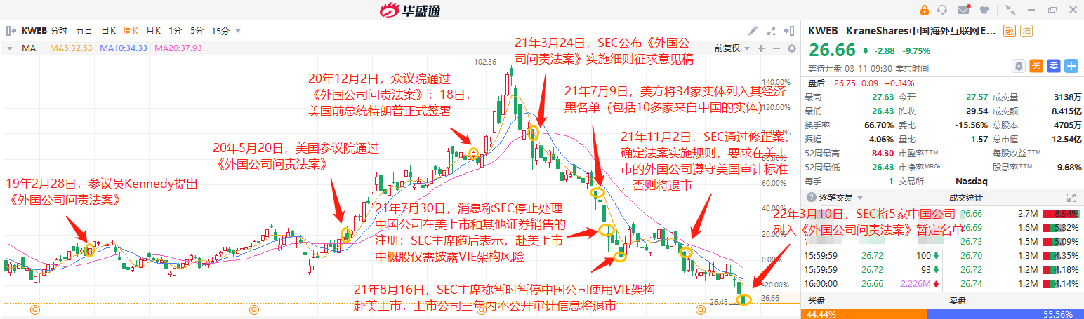 以下是《外国公司问责法》历史梗概,每次法案的推进都会引发中概股应声大跌。(KWEB是中国海外互联网ETF,成份股包括腾讯、阿里、京东、百度、美团等一众明星中概股)。