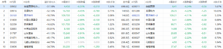 华能国际电力股份A股跌6.24%,H股跌6.51%,龙源电力A股跌4.22%,H股跌4.45%,百济神州A股跌4.11%,H股跌5.43%。