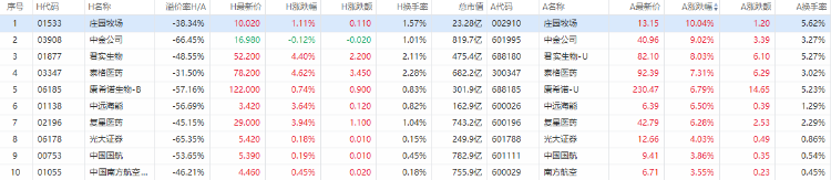 以A股收盘时间,AH股涨幅前10如下: