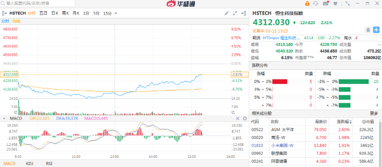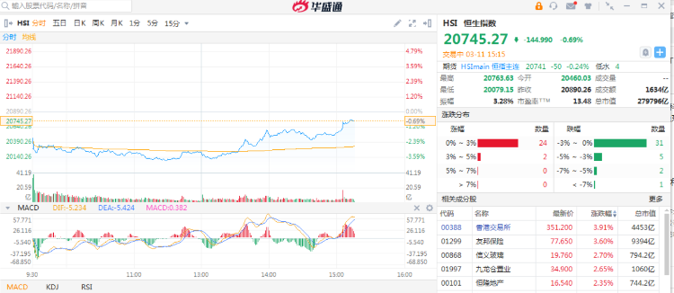 华盛资讯3月11日消息,港股快速拉升。恒指跌幅不足1%,报20745.27点,恒生科技指数跌幅收窄至2.81%,此前一度跌超8%,港交所、友邦保险涨超3%,领涨蓝筹;小米、商汤翻红,明星科网股跌幅普遍收窄,京东跌幅不足10%,腾讯跌幅收窄至3%。