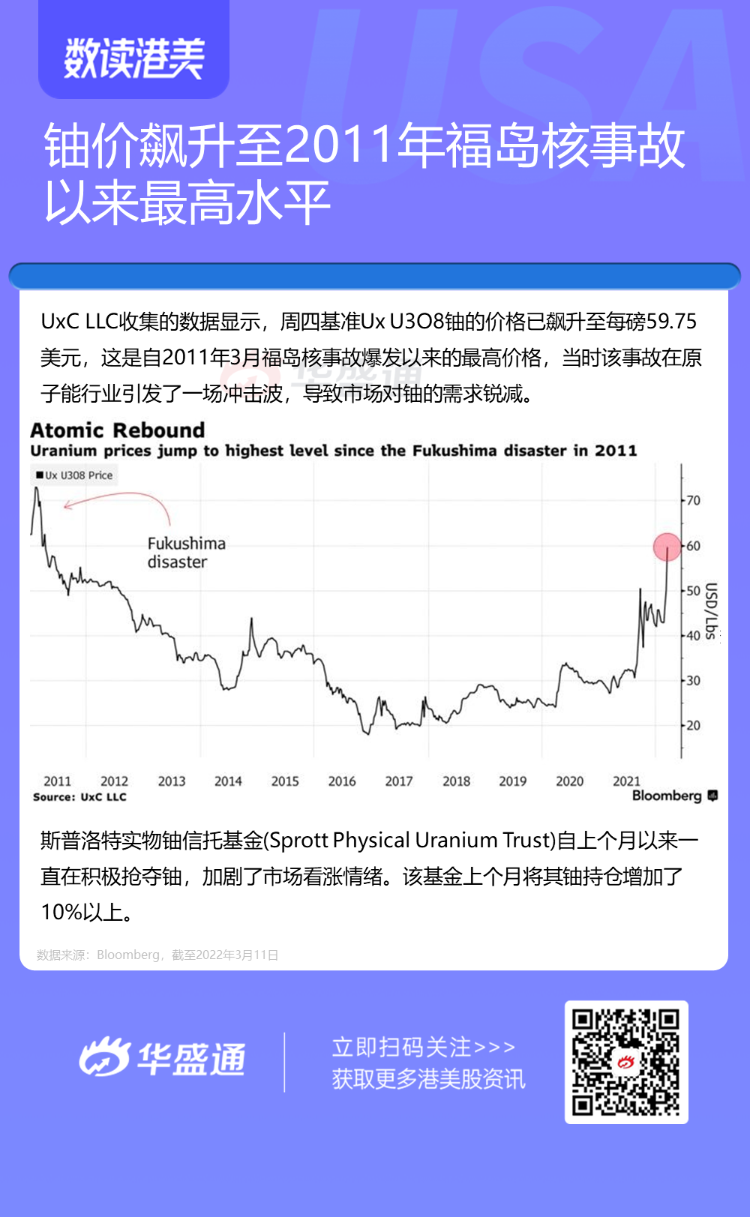 近日,铀现货价格飙升至10年来最高水平,原因是市场担心欧美针对俄罗斯的潜在制裁可能会扰乱本已紧张的市场。UxC LLC收集的数据显示,周四基准Ux U3O8铀的价格已飙升至每磅59.75美元,这是自2011年3月福岛核事故爆发以来的最高价格。