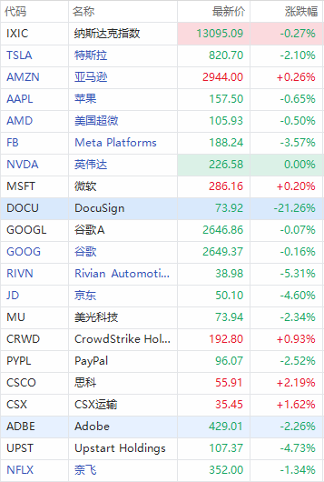 其中,DocuSign大跌逾20%,公司此前发布第一季度和财年的疲弱指引。