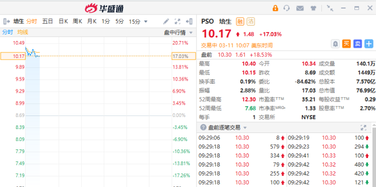 培生(PSO)涨逾17%,此前阿波罗全球管理表示正在评估现金收购该公司。